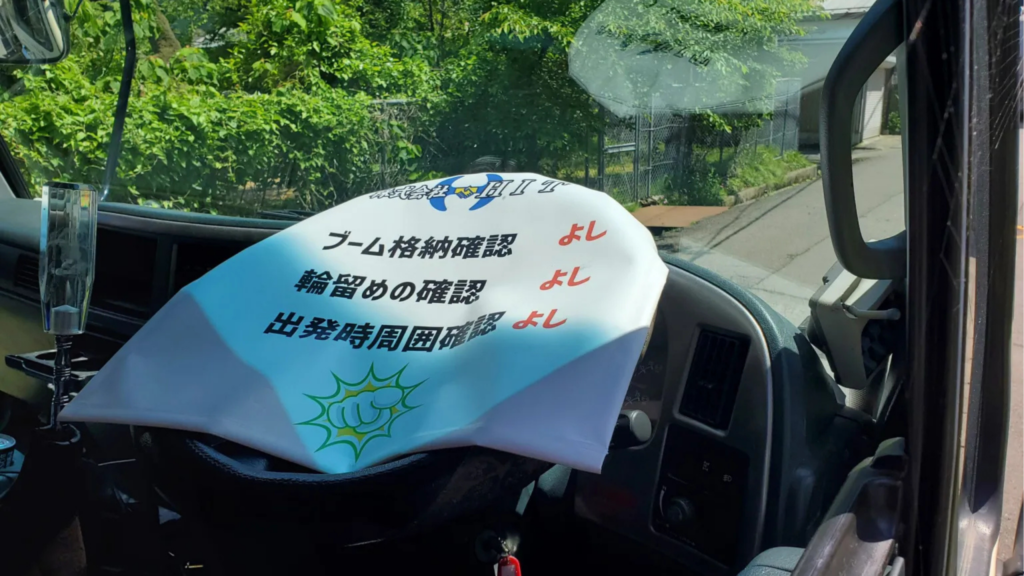 弊社の保有するユニックの危険防止のために作成したハンドルカバーです。